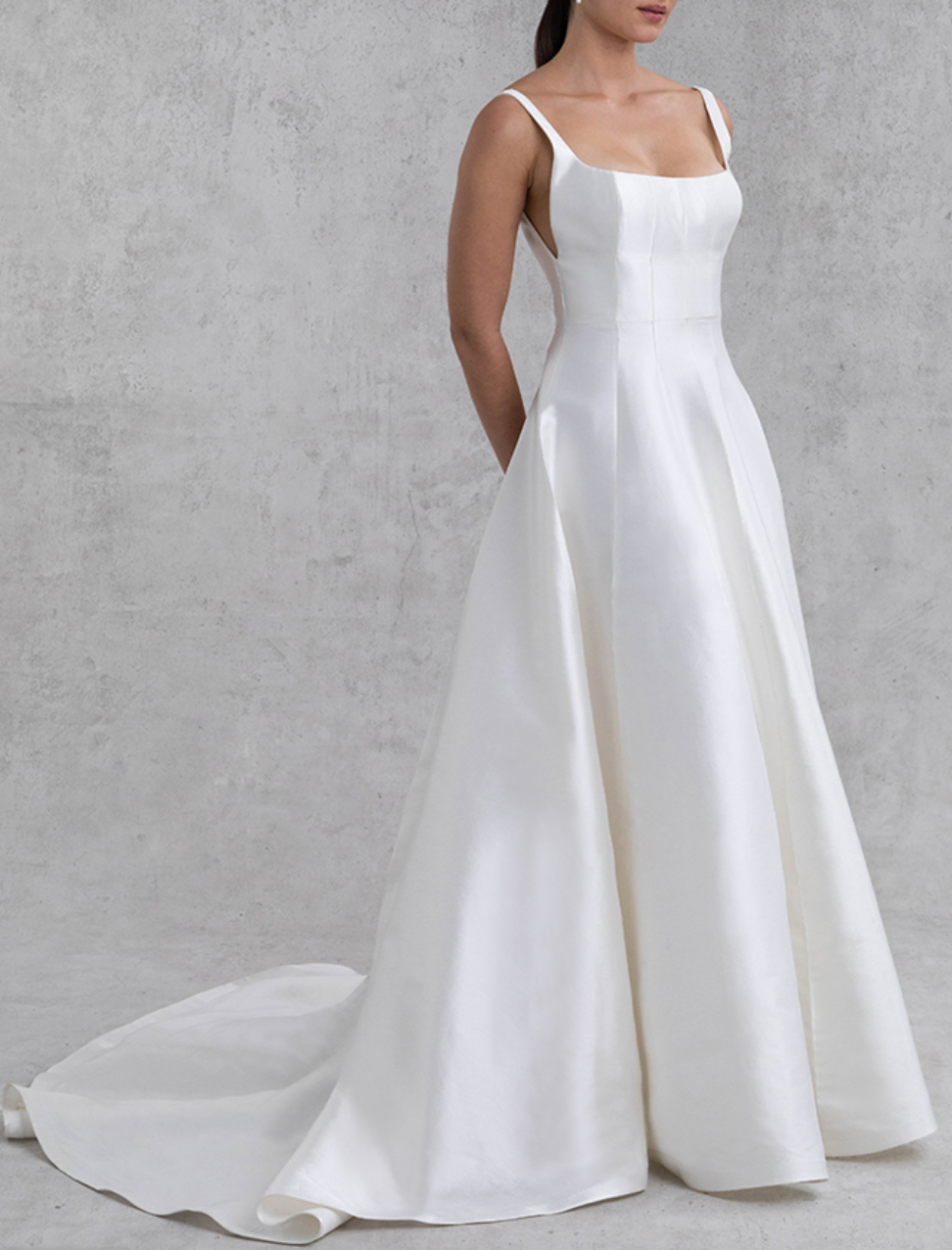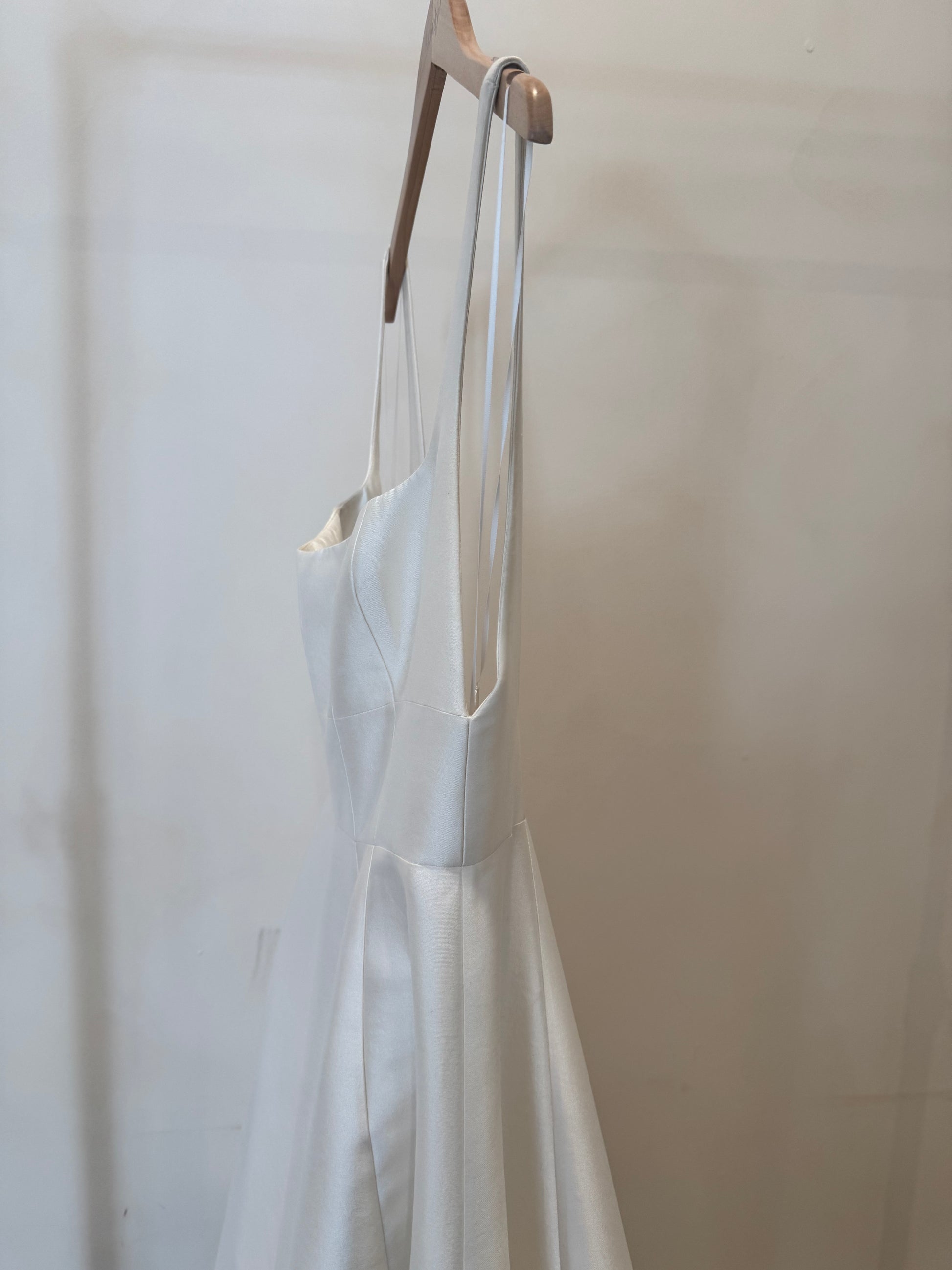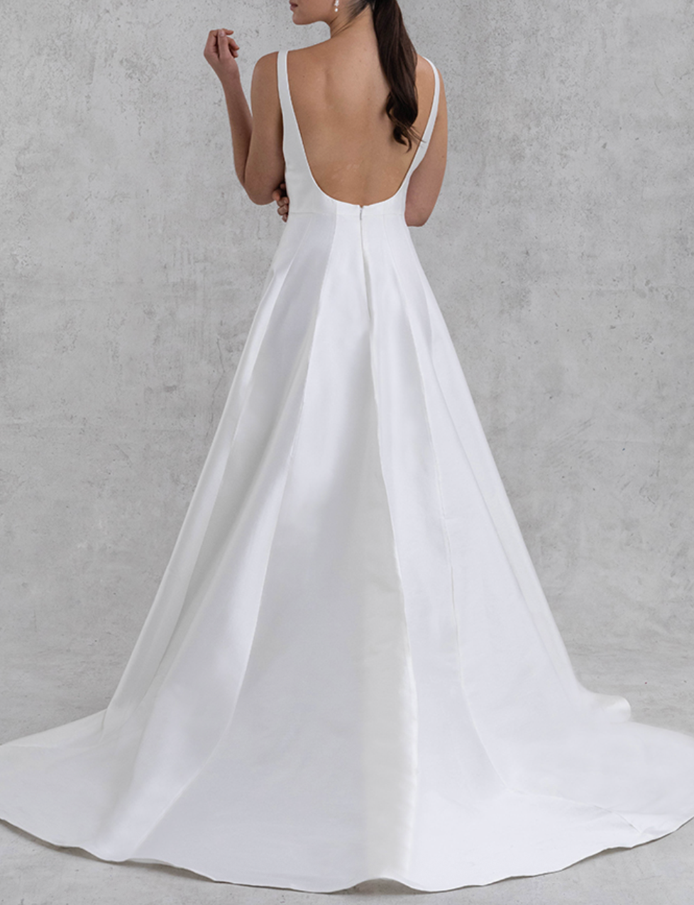 Description: Produced in a stunning new silk wool fabrication, Aurelia is a modern twist of the classic ball gown. Featuring an a-line silhouette with vertical paneling, wide scoop neckline and open back.