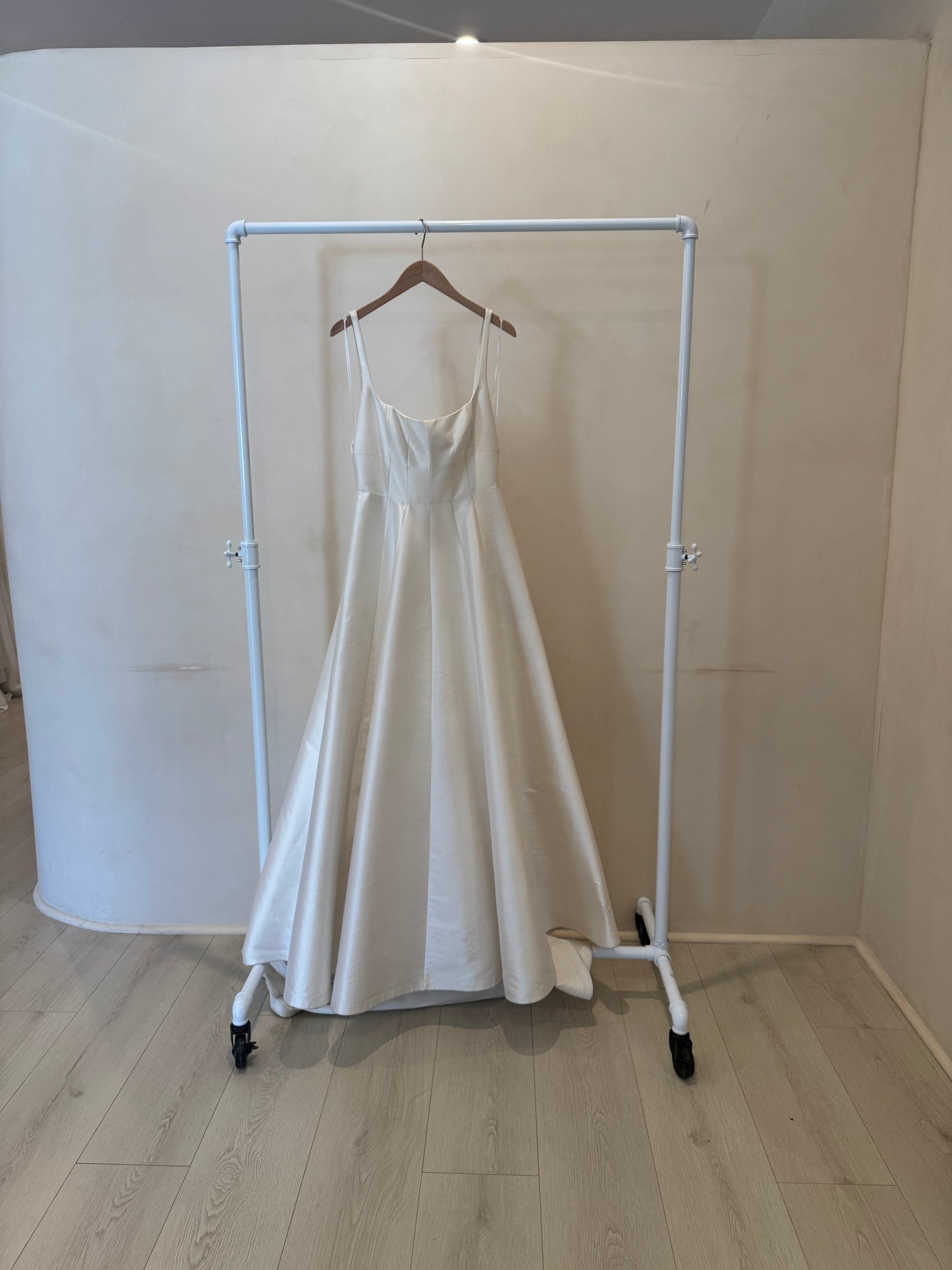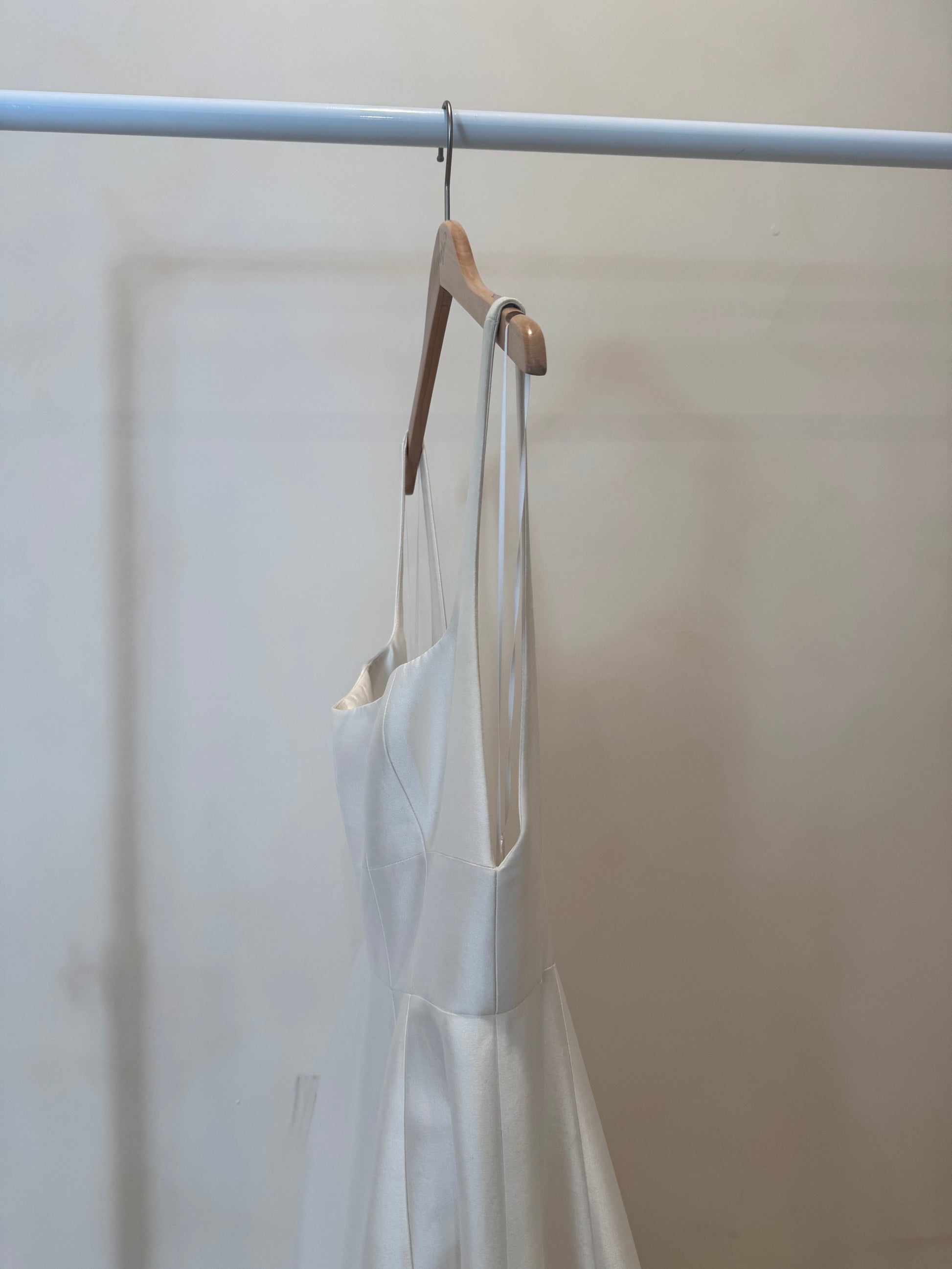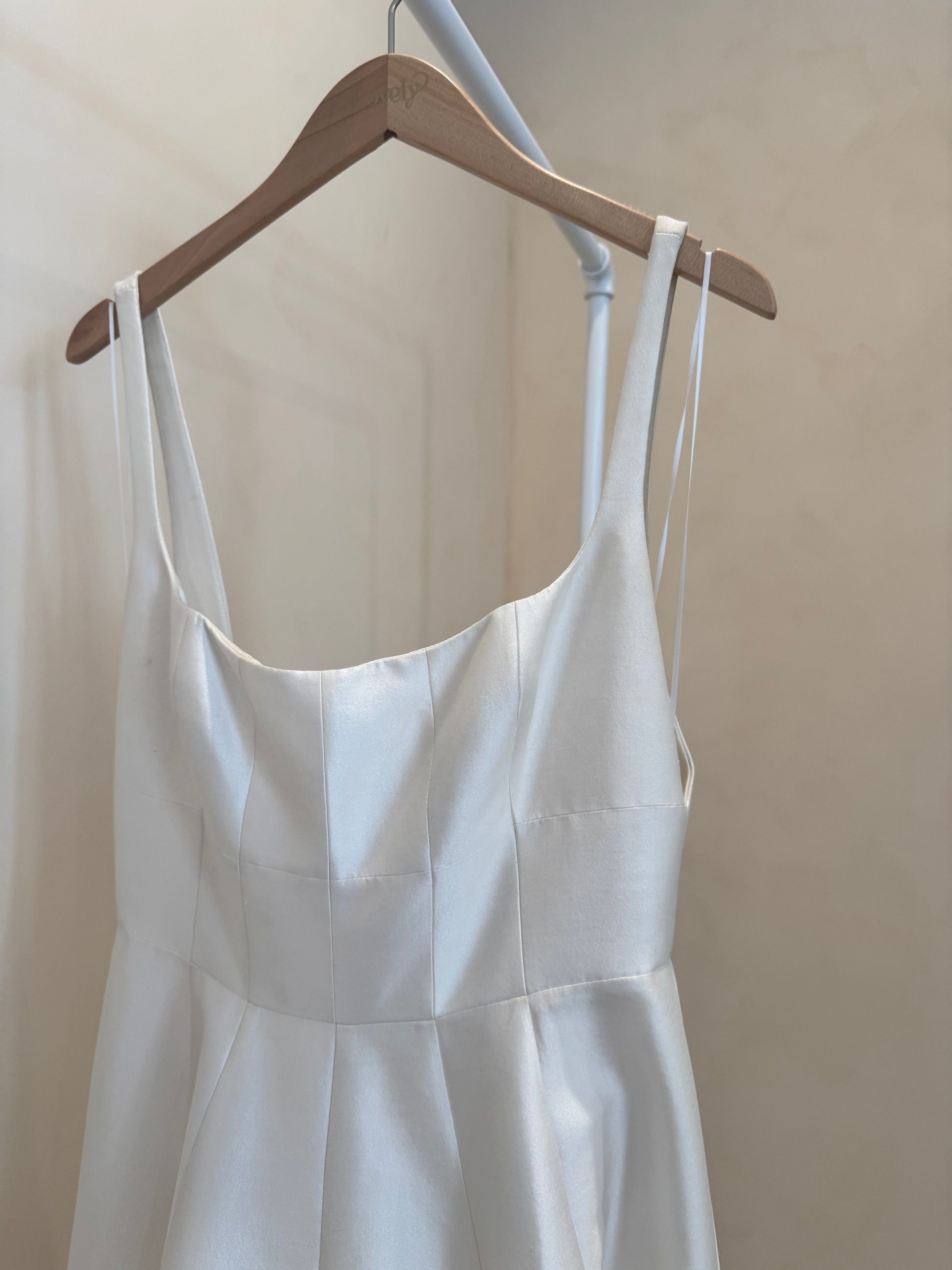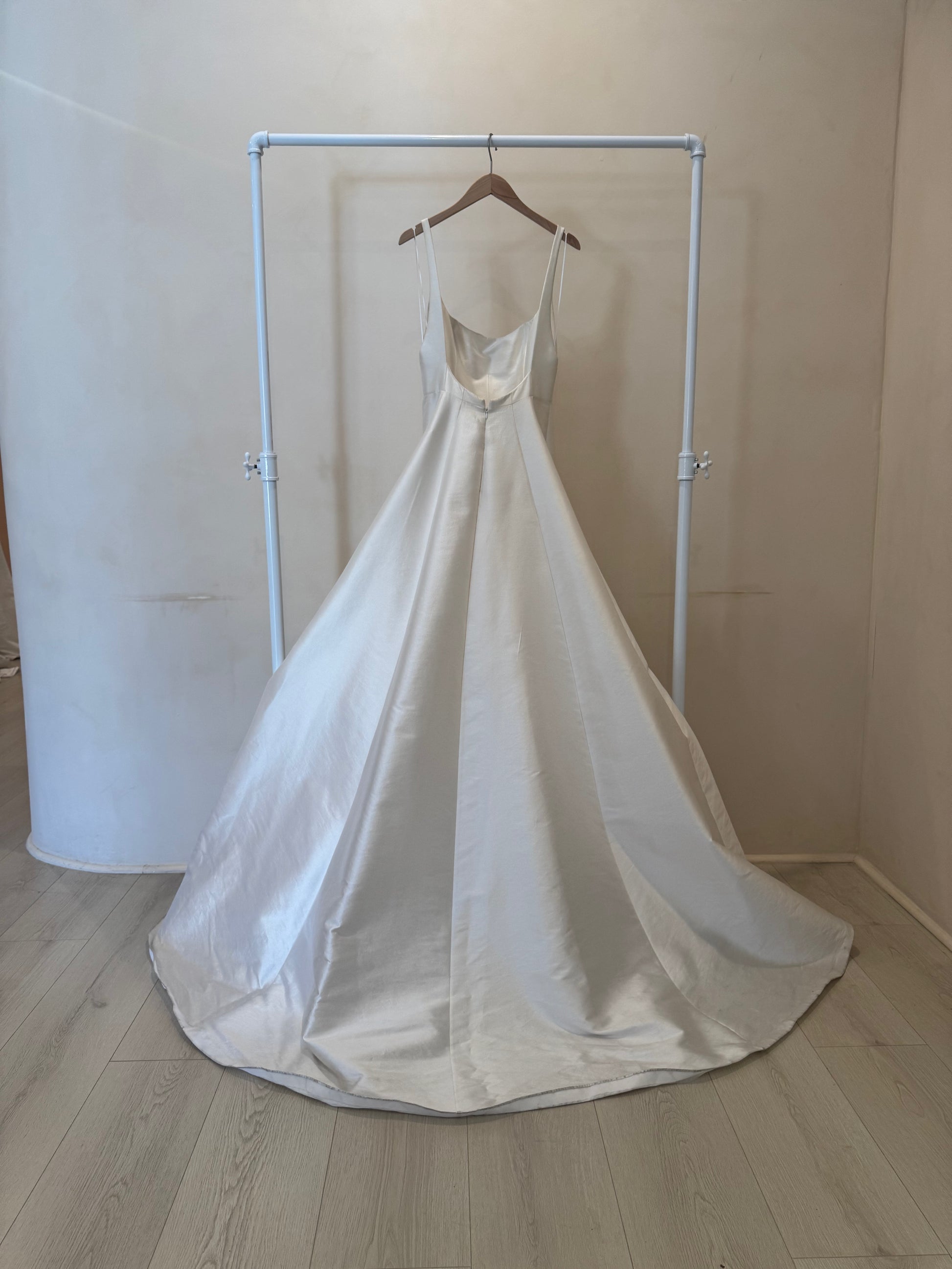 Description: Produced in a stunning new silk wool fabrication, Aurelia is a modern twist of the classic ball gown. Featuring an a-line silhouette with vertical paneling, wide scoop neckline and open back.