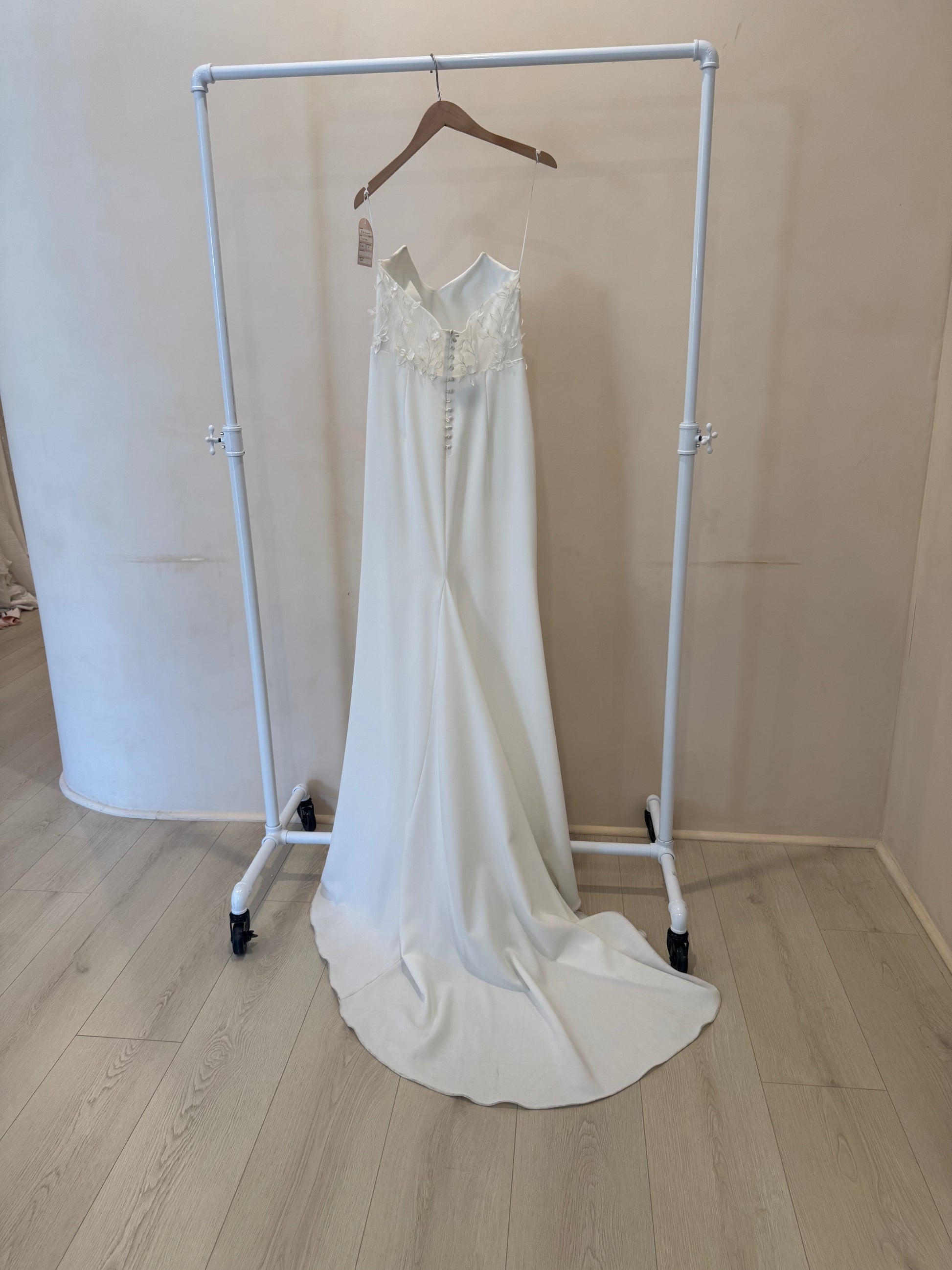 Description: This fitted strapless gown has a scoop neckline with an unforgettable draped bodice. Featuring a sheer back with exposed boning for a dramatic touch.