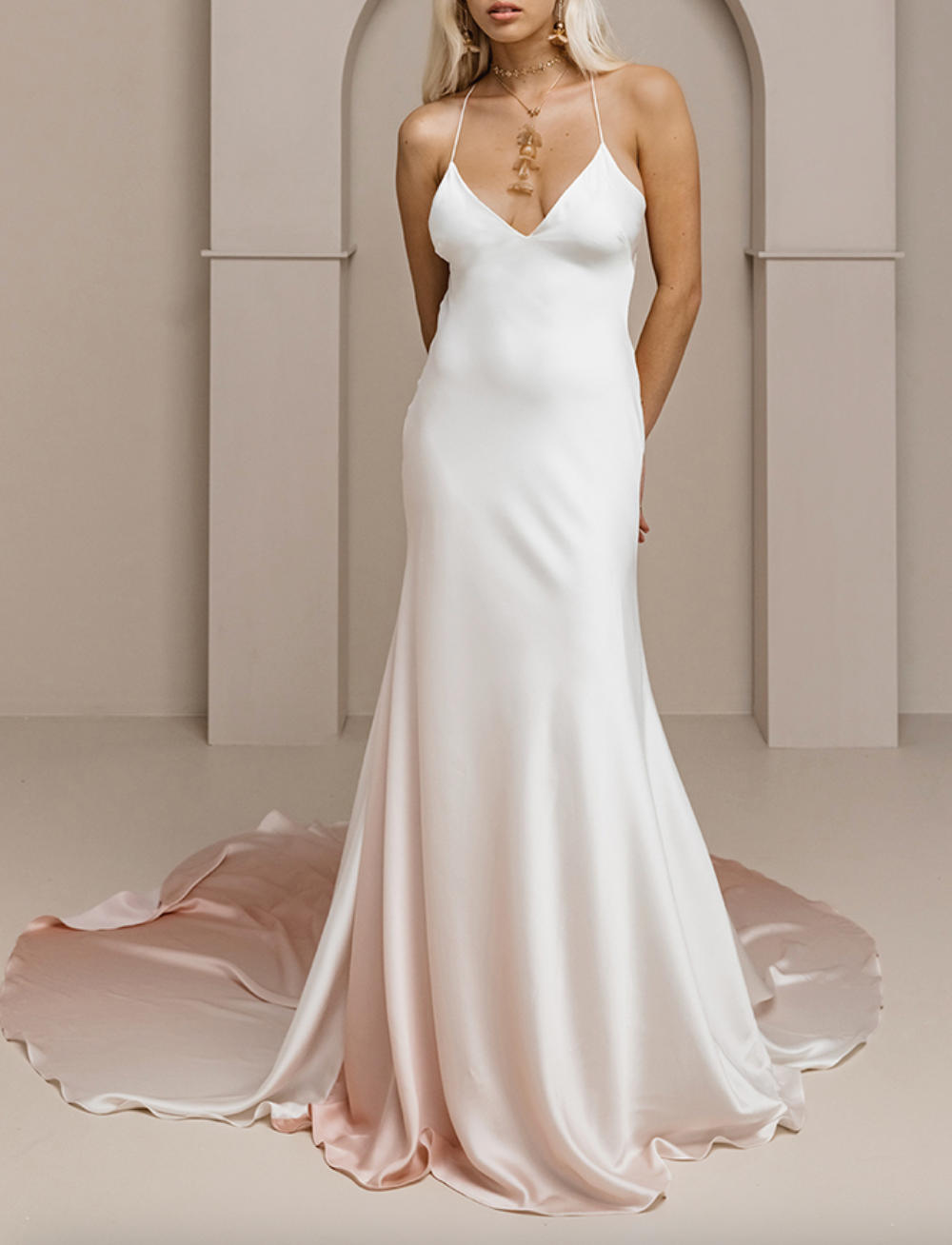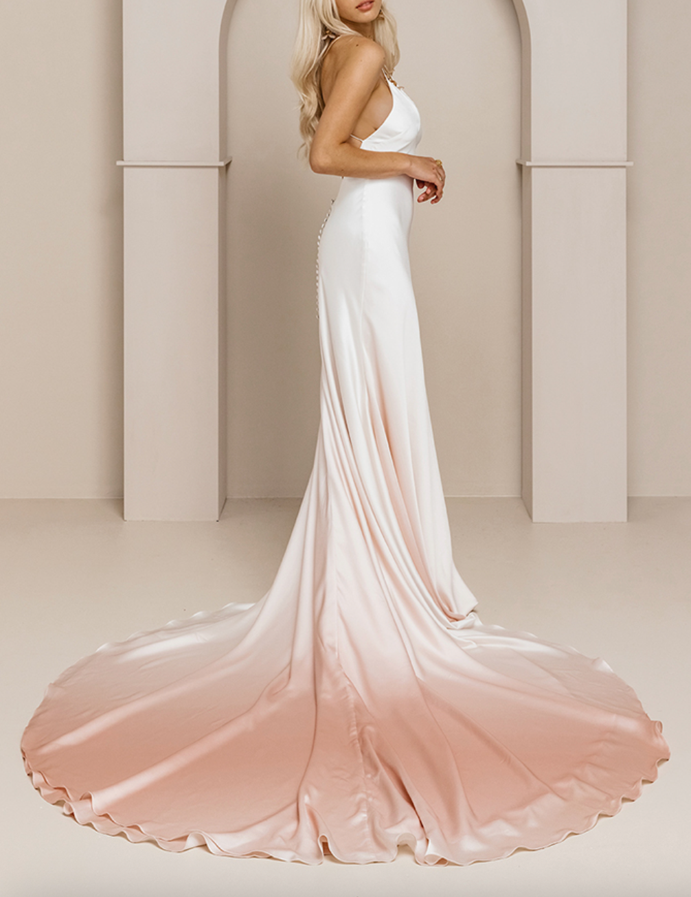 Satin gown with blush gradient, demi plunge V neck, scoop back, and delicate straps.